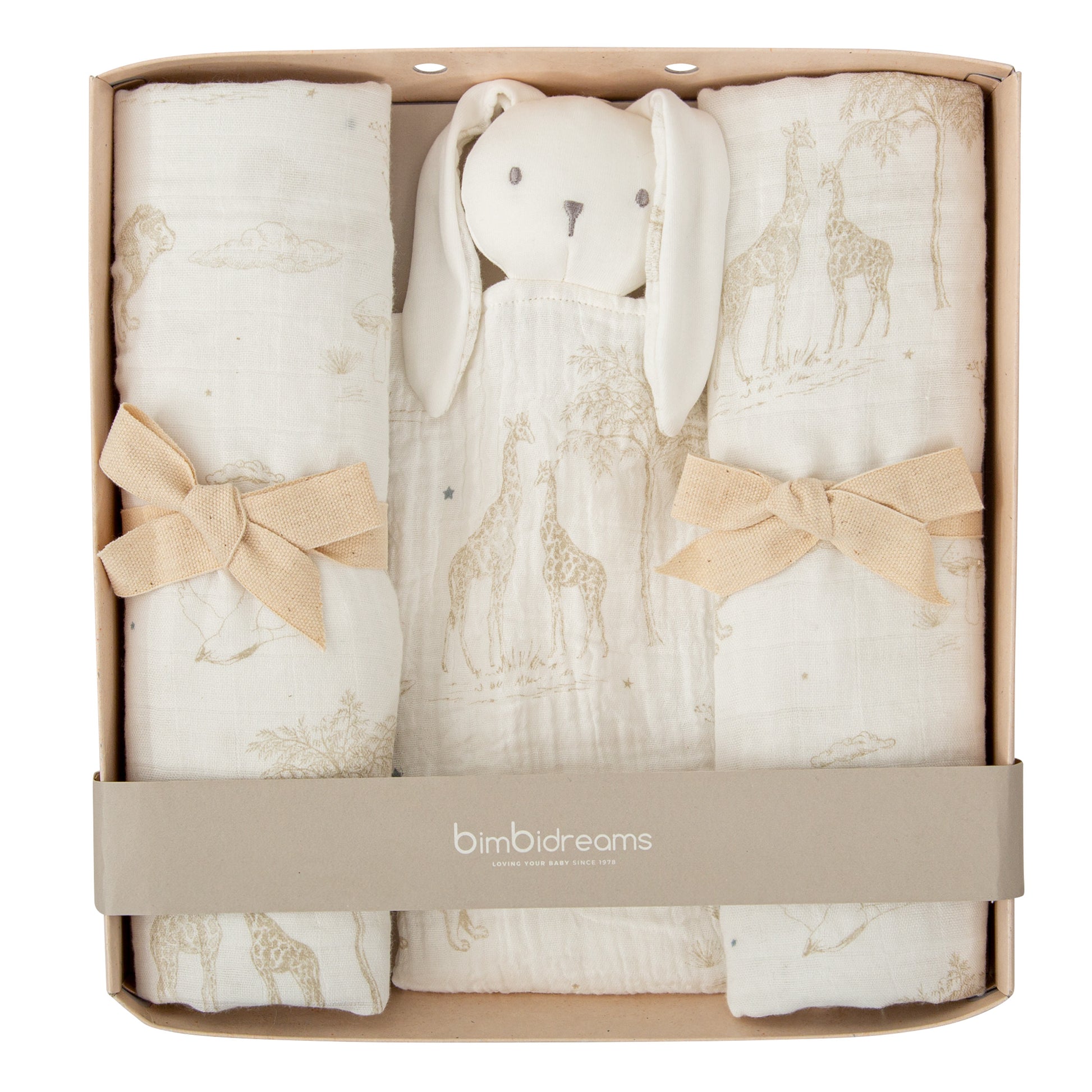 El set de regalo Bimbidreams es el detalle perfecto para recién nacidos. Incluye dos gasas de muselina y un suave doudou con forma de conejito, confeccionados en una mezcla natural de 50% bambú viscosa y 50% algodón orgánico, que ofrece suavidad, transpirabilidad y el máximo cuidado para la piel del bebé.