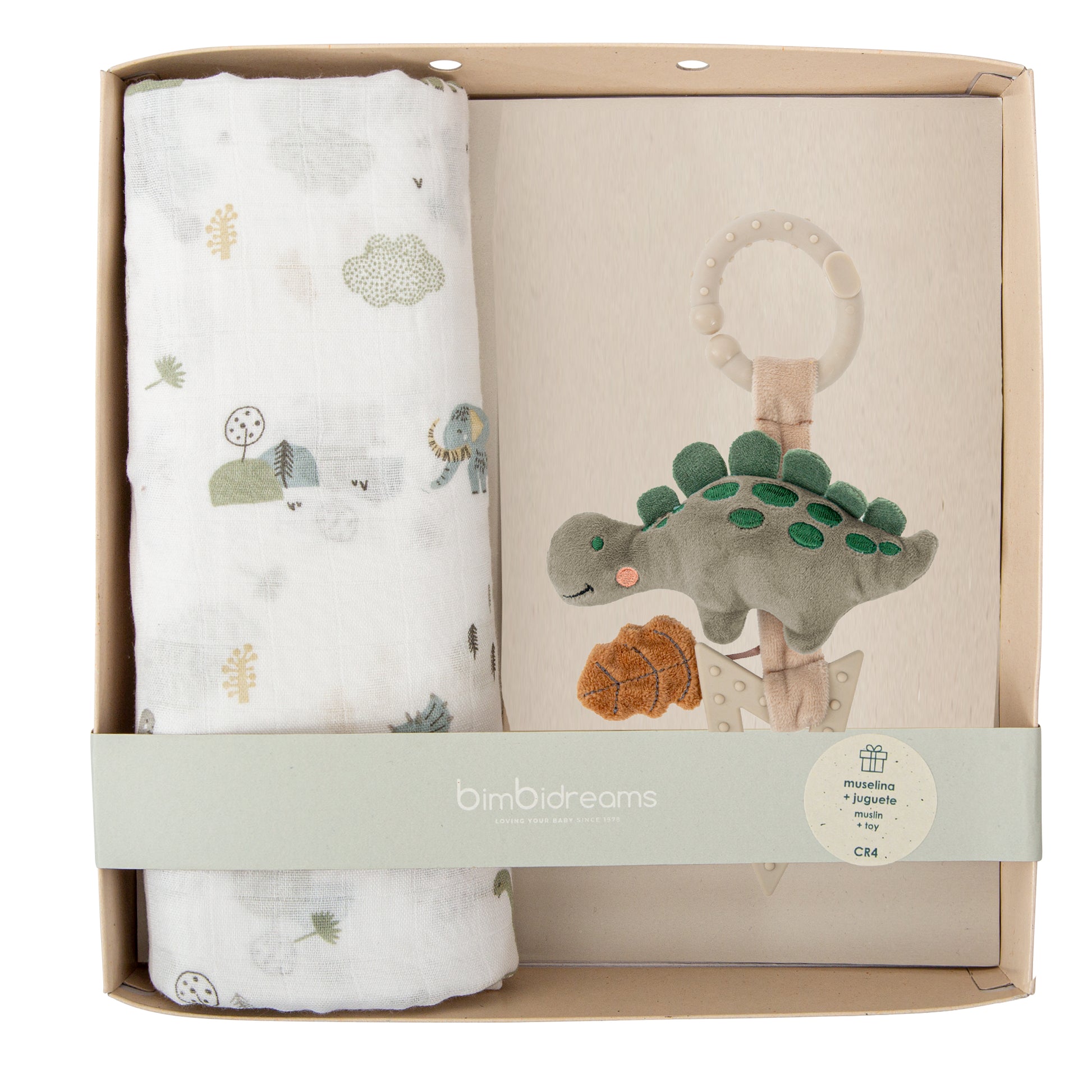 Caja regalo ideal para recién nacido que combina una muselina de bambú suave y transpirable con un mordedor/juguete Bimbidreams, diseñado para estimular los sentidos del bebé y aliviar la dentición.